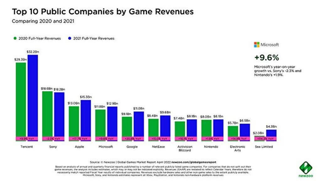 Newzoo также отметила рост Microsoft на 9,6% по сравнению с ростом Nintendo на 1,9% и падением Sony на 2,3%. Это объясняется успехом Game Pass, в то время как Sony и Nintendo испытывают трудности после пандемии 2020 года.