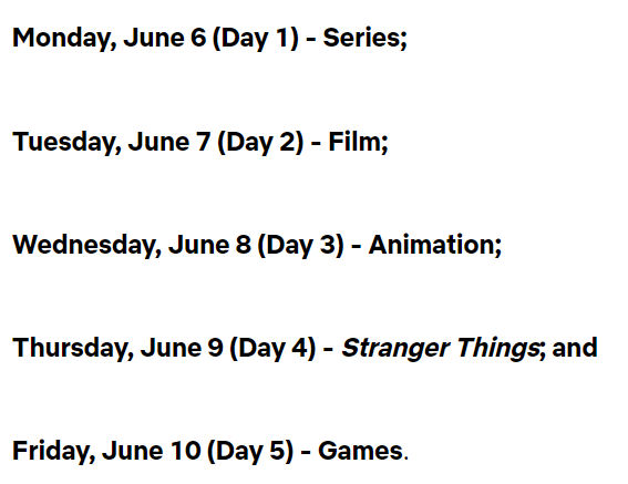 В расписании Netflix указал, что каждый день Geeked Week будет посвящён отдельной теме. 10 июня — Games (игры).