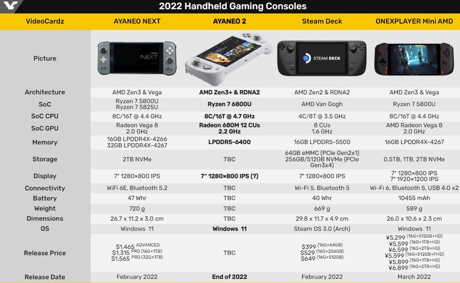 APU Ryzen 7 6800U «Rembrandt» основан на обновленной архитектуре процессора Zen 3+ с 8 ядрами и 16 потоками, которые разгоняются до 4,7 ГГц, что на 300 МГц больше, чем в системе AYANEO Next. Графическая архитектура RDNA 2 соответствует той же архитектуре GPU, что и в Steam Deck от Valve. Производительность – 3,38 TFLOPs против 1,6 TFLOPs.