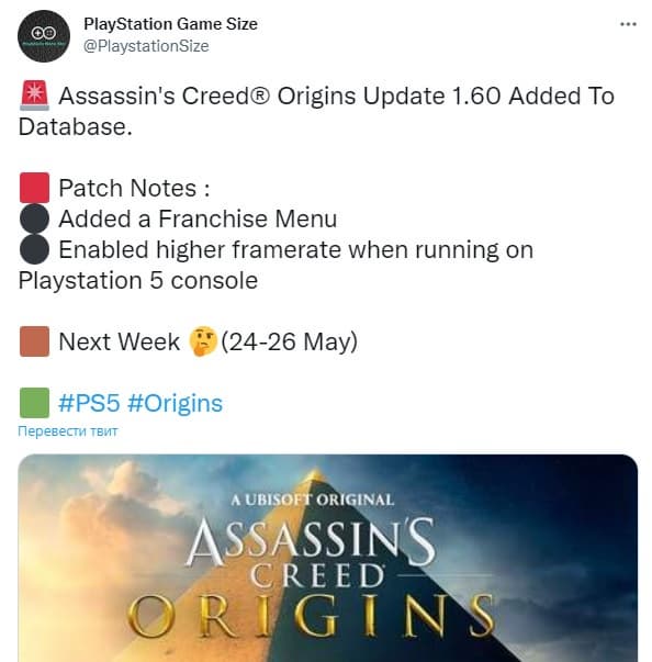 Ubisoft объявила, что Assassin's Creed: Origins скоро получит обновление, которое разблокирует частоту кадров до 60 FPS на PlayStation 5 и Xbox Series X.