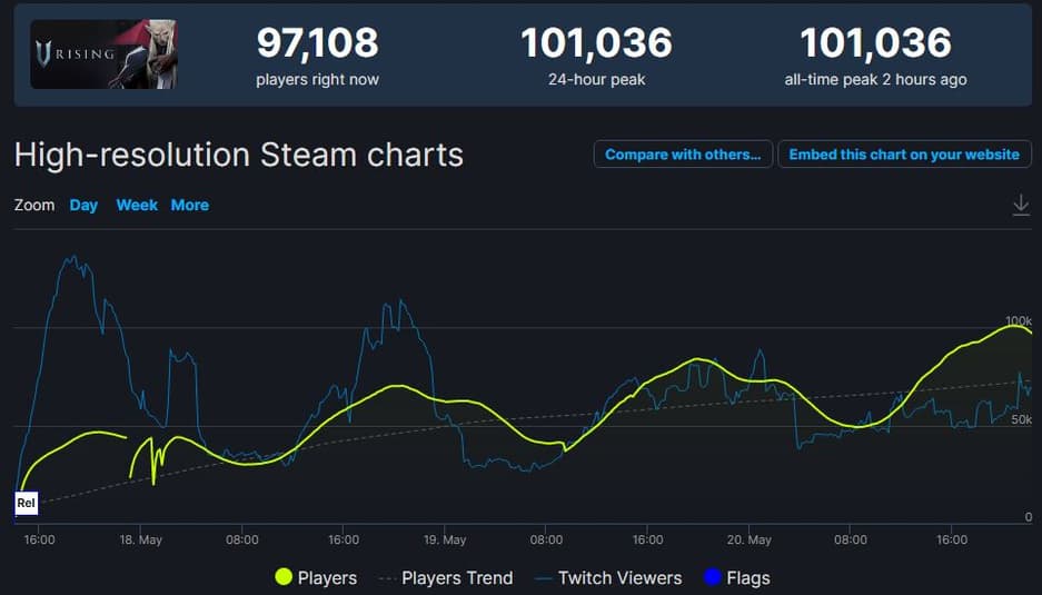 V Rising демонстрирует также довольно высокие показатели по количеству одновременно активных пользователей. На момент написания этих строчек, следующим графом (или графиней) Дракулой пытаются стать свыше 97 тысяч игроков, а пиковый онлайн перешагивал отметку в 101 тысячу.