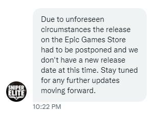 Есть лишь сообщение, которое было получено в середине мая. Sniper Elite 5 не выйдет в EGS «из-за непредвиденных обстоятельств». Новую дату релиза в EGS не назвали.