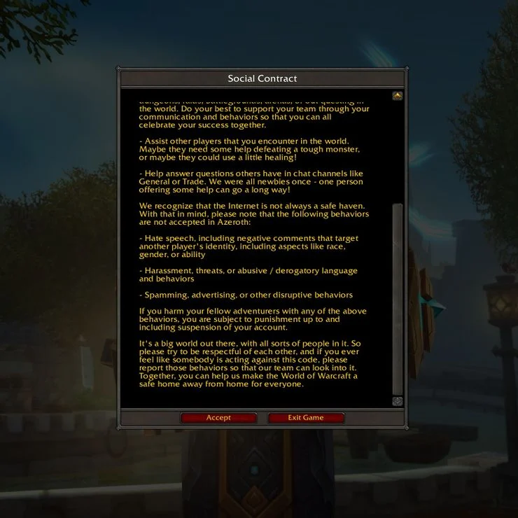 В контракте перечисляют виды некорректного поведения. Например, не использовать уничижительные комментарии, не оскорблять других участников сообщества World of Warcraft. Напоминают, что мир игры «разнообразен»: его населяют люди с разным прошлым, культурой, историей. Призывают быть дружелюбными.