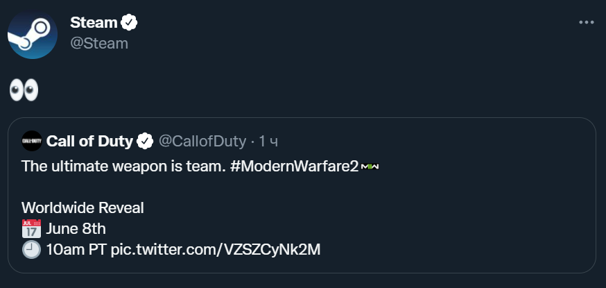 В аккаунте Steam поделились постом с объявлением о презентации CoD: Modern Warfare II и сопроводили сообщение «глазастым» смайликом.