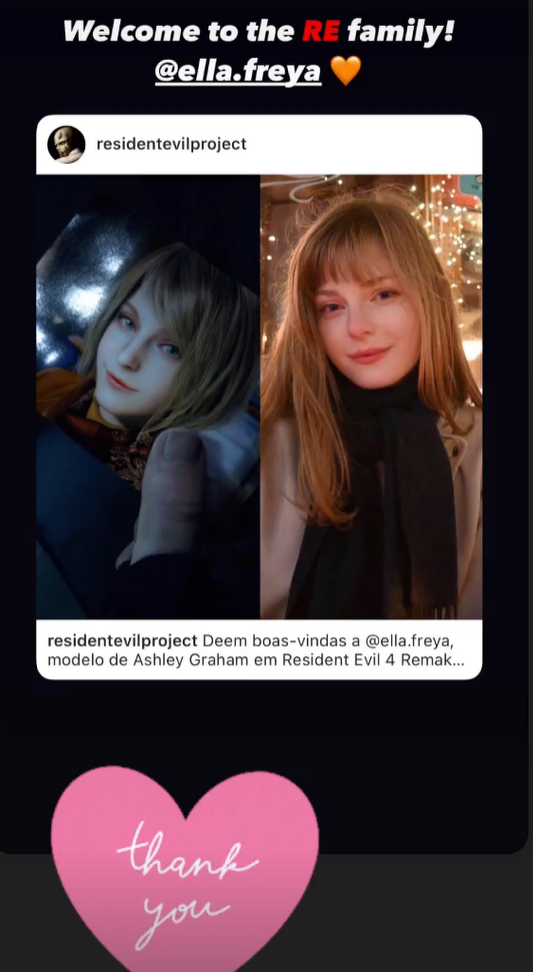 Ответ, возможно, нашёлся. В социальной сети Ella Freya написала: «Когда я увидела трейлер, я чуть не расплакалась. Теперь я очень счастлива. Спасибо всем от всего сердца #Biohazard [на японском: バイオハザード ] #Residentevil4remake #Ashley Graham [на яп. アシュリーグラハム ]».