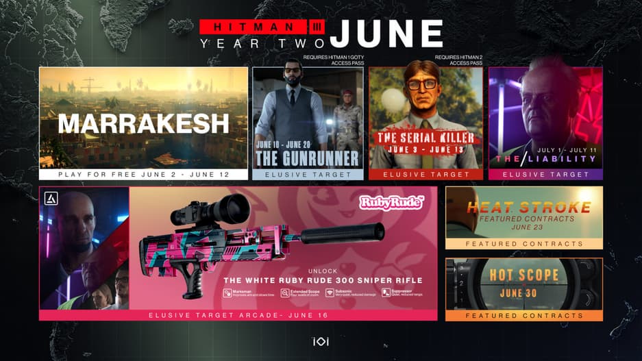 Разработчики объявили планы на ближайшие недели. В сети появилась специальная «дорожная карта» на июнь 2022 года. Карта «Марракеш» доступна до 12 июня, а также появится несколько новых целей, которые необходимо выследить и уничтожить. Кроме этого, можно разблокировать специальную снайперскую винтовку и несколько контрактов.