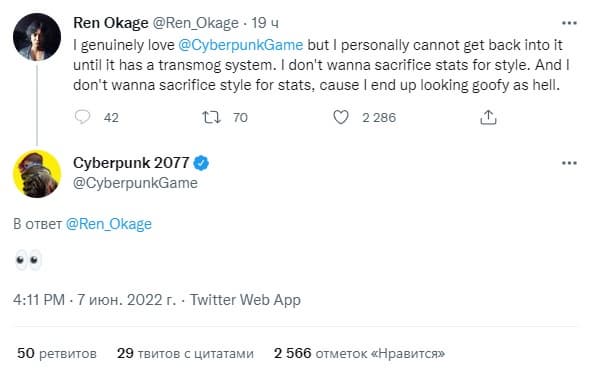Разочарованный фанат Cyberpunk 2077 в сообщении в Twitter пожаловался на отсутствие в игре системы трансмогрификации предметов, и его сообщение прокомментировала аккаунт студии CD Projekt, что вызвало волну спекуляций.