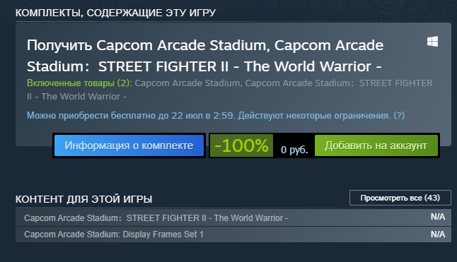 До 22 июля 2:59 по московскому времени можно бесплатно добавить в библиотеку Steam комплект «Capcom Arcade Stadium, Capcom Arcade Stadium:STREET FIGHTER II - The World Warrior –». Получить можно тут или тут.