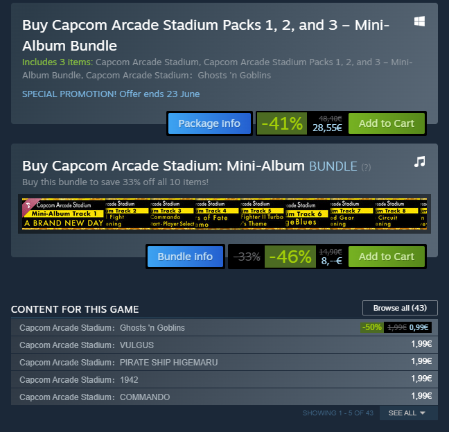 Поскольку Capcom прекратила продавать свои игры в российском Steam, то страница сборника Capcom Arcade Stadium заметно отличается по наполнению, если смотреть из другой страны: