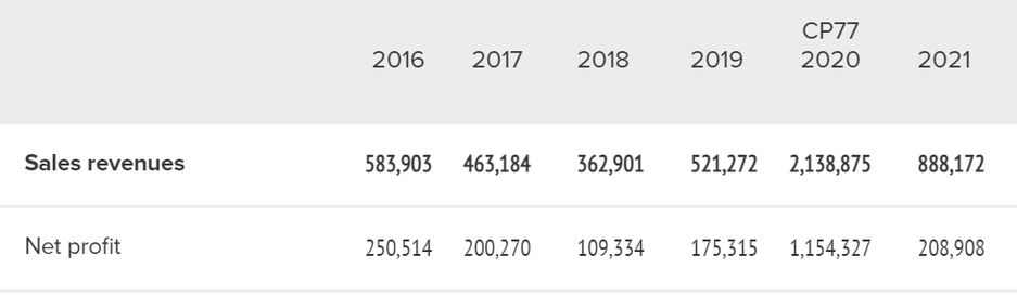 Чистая прибыль за 2016-2021 (цифры в тысячах).