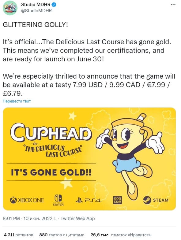 Дополнение Cuphead – The Delicious Last Course появится 30 июня 2022 года на ПК в Steam, GOG и Microsoft, PlayStation 4, PlayStation 5, Xbox One, Xbox Series X|S и Nintendo Switch.