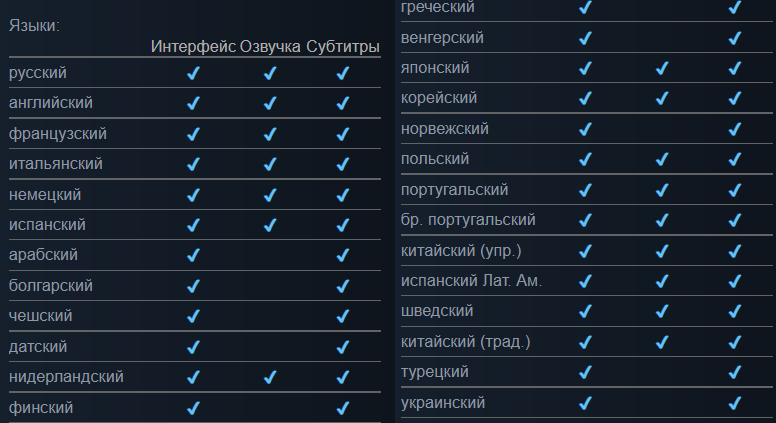 Список поддерживаемых языков: заявлена полная русская локализация (озвучка + субтитры), а также украинские субтитры.