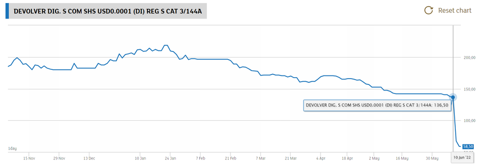 На графике показано, что акции Devolver Digital торговались по цене выше 200 GBX в начале 2022 года и затем их стоимость начала опускаться, иногда приподнимаясь. Начиная с 10 июня видно, как ускорилось падение.