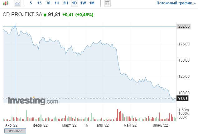 Сейчас акции CD Projekt торгуются в диапазоне 90-92 польских злотых за акцию (или ~$20-20,5).