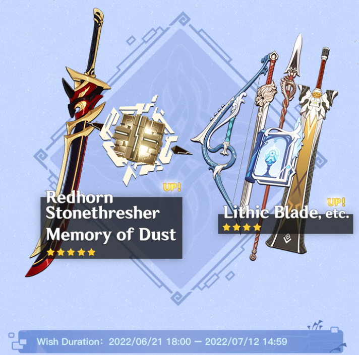 - 4 звезды: Бесструнный (лук), Гроза Драконов (копьё), Церемониальные Мемуары (катализатор), Каменный меч и Драконий Рык (меч).