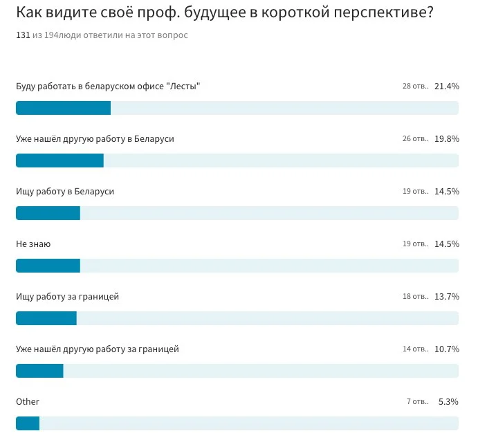 Примерно треть сотрудников Wargaming уволилась, треть переехала или занята переездом (~90% в Литву). Каждый шестой сотрудник «не знает своего будущего», 13% осведомлены о том, что будут работать под новым юридическим лицом, которое аффилировано с Lesta Studio.