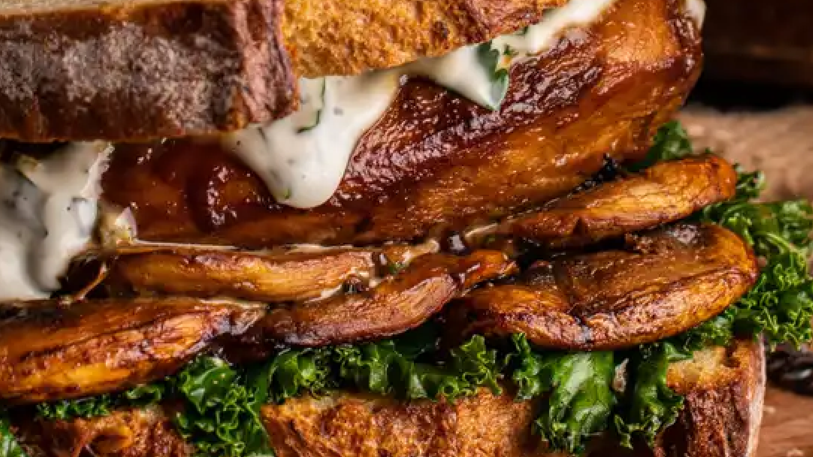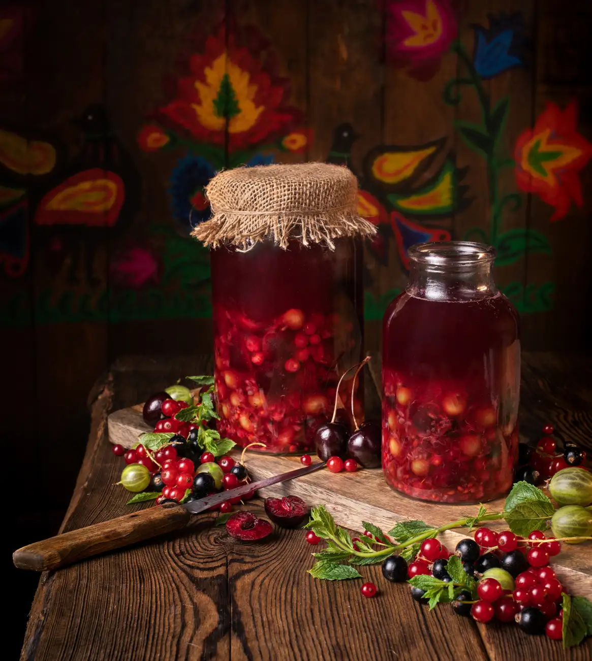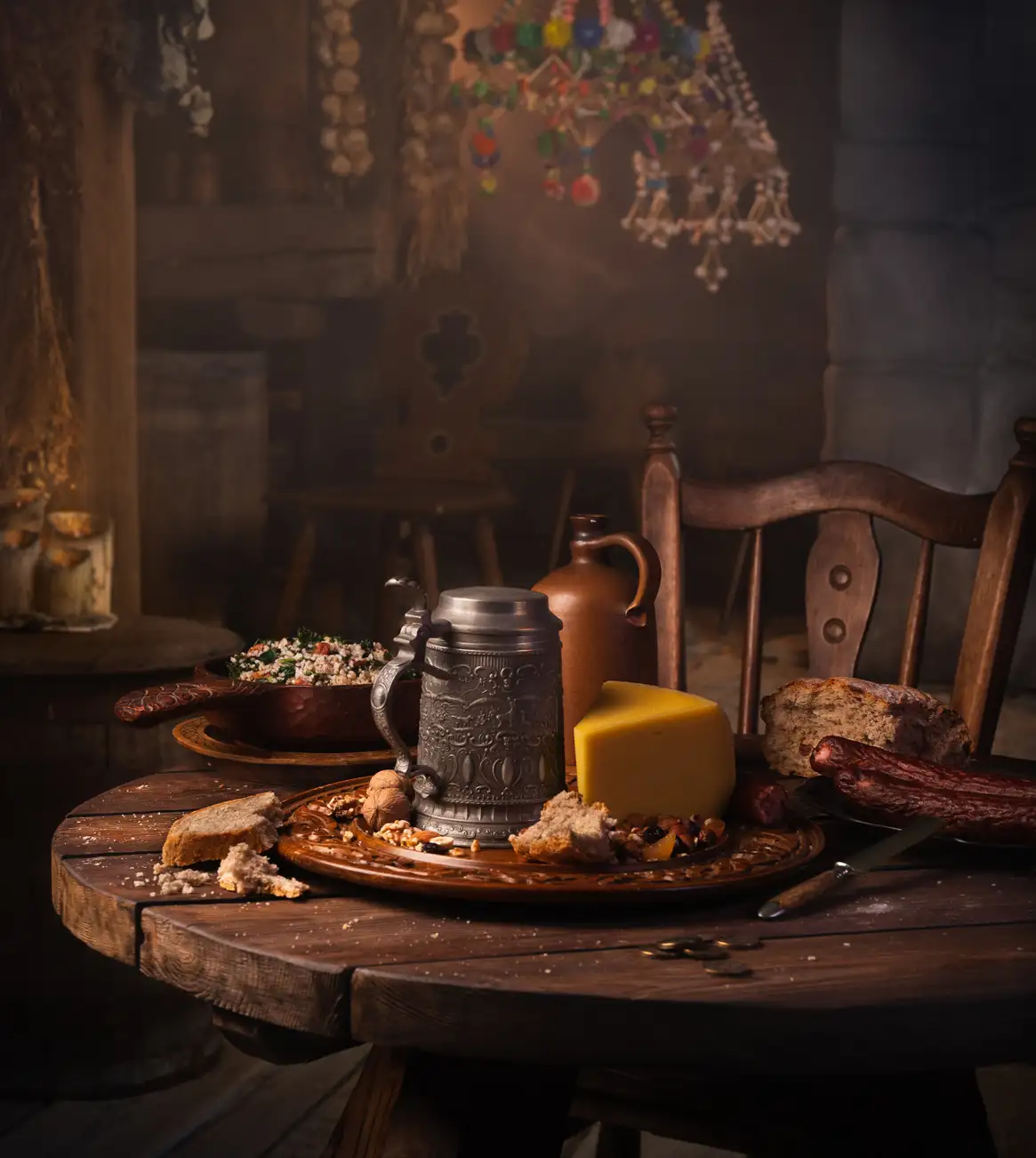 В наличии брусничный сок и таинственный напиток на тарелке, что стоит рядом с куском сыра, а на фоне можно заметить ковш, который чем-то наполнен до краёв. Получивший удар ножом бургер тоже есть.
