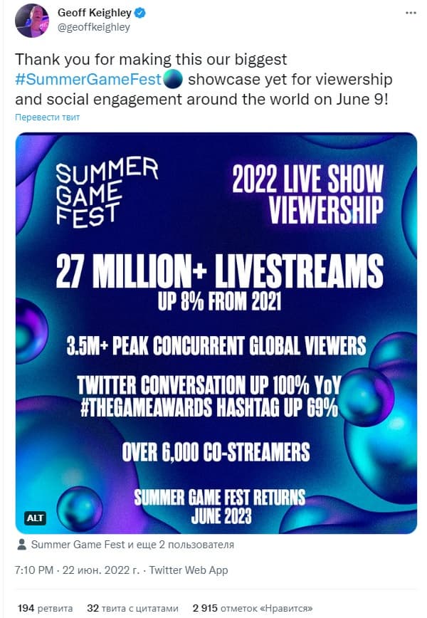 Summer Game Fest 2022 посмотрели более 27 миллионов раз, что на 8% больше, чем в прошлом году. В пиковый момент количество одновременных зрителей достигло 3,5 миллионов. Кроме того, было организовано более 6 000 дополнительных трансляций, во время которых блогеры и игроки комментировали происходящее.