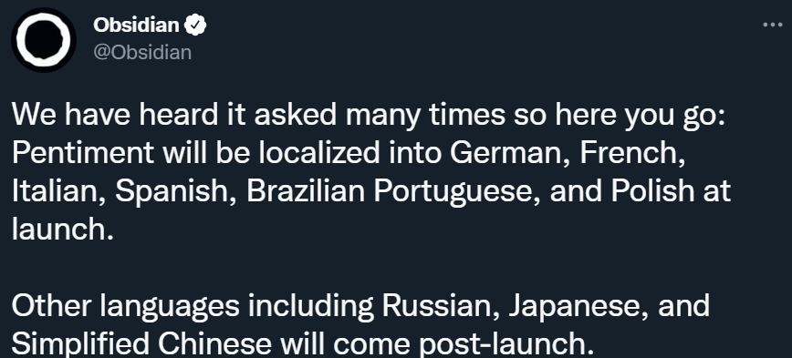 Obsidian Entertainment в социальной сети рассказала о планах по переводу игры на другие языки.