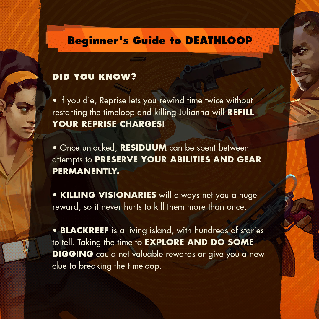 Bethesda уточнила, что ликвидация идеологов позволит заполучить крупную награду, имеет смысл ликвидировать их повторно. Резидиум можно потратить на сохранение способностей и снаряжения (в игре используются элементы roguelike). Также рекомендуют тщательно исследовать окружение. Способность «Реприза» позволит герою 2 раза отмотать время после смерти.