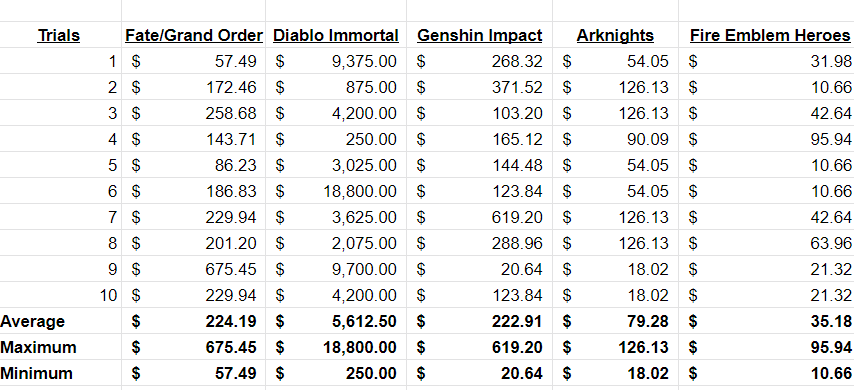 Kdawg сделал по 10 «бросков» в каждой игре, и симуляция показала, сколько необходимо денег для получения одного лучшего предмета, героя или самоцвета (5 звёзд или 6 звёзд в зависимости от игры):