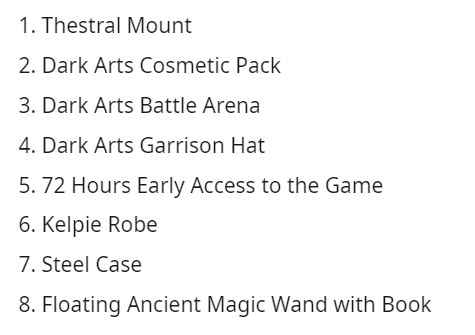 В списке есть некая арена, набор косметических предметов и ездовой питомец (Фестрал, вероятно, крылатый конь).