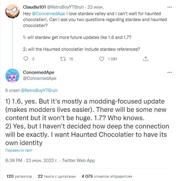 Эрик «ConcernedApe» Барон не забыл об игре, которая принесла ему успех: Stardew Valley. Несмотря на занятость с Haunted Chocolatier, он сказал одному из подписчиков в Twitter, что обновление 1.6 уже готово.