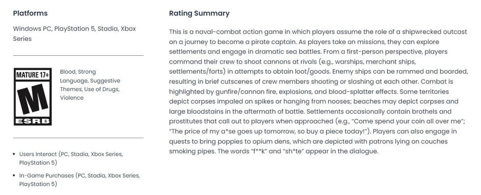 Судя по описанию, в Skull and Bones будут демонстрироваться сцены жестокости и насилия, а игроки смогут время от времени посещать бордели с девушками легкого поведения и употреблять психотропные вещества.