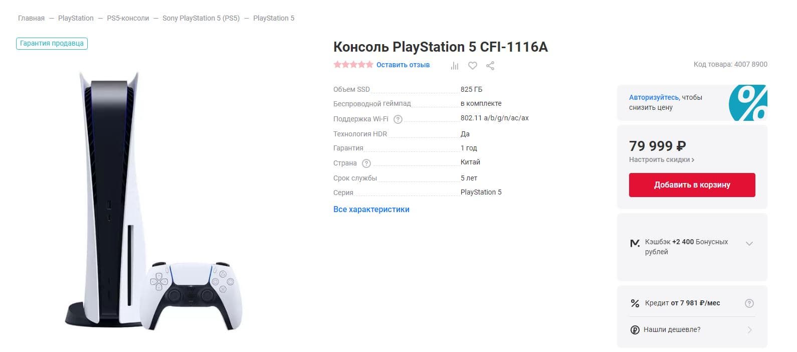 На полках российских торговых сетей по продаже электроники и бытовой техники «М.Видео» и «Эльдорадо» снова появились консоли PlayStation 5. На выбор доступны исключительно игровые устройства с оптическим приводом. Цена — 79 999 рублей.