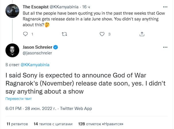 В обсуждении темы активно участвовал журналист Bloomberg Джейсон Шрейер. Редактор в очередной раз заявил, что Sony скоро подтвердит ноябрьскую дату выхода God of War Ragnarok. Интересно, что он дал понять, что не стоит рассчитывать на июльский State of Play.