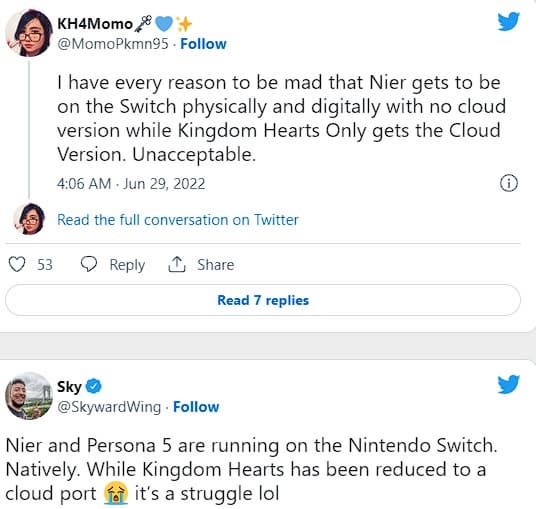 Очевидно, заставить Kingdom Hearts работать локально было сложно, но, в то же время, у NieR Automata и Persona 5 нет особых ограничений. Стоит вспомнить, что не было особых проблем у Doom Eternal и The Witcher 3. И многие считают облачную версию неприемлемой в отношении к своей любимой игре. Одна из фанаток пишет: