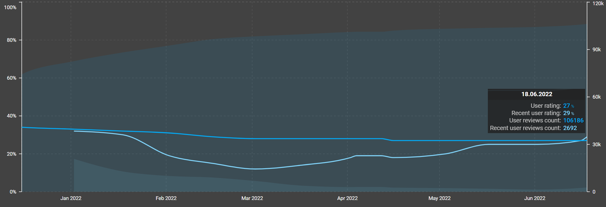 Как оказалось, пользовательский рейтинг у игры тоже изменился. Если общая картина в целом не изменилась, в Steam у игры «в основном отрицательные» отзывы (28% положительных из 107 955 штук), то с недавними обзорами дела обстоят чуть лучше.