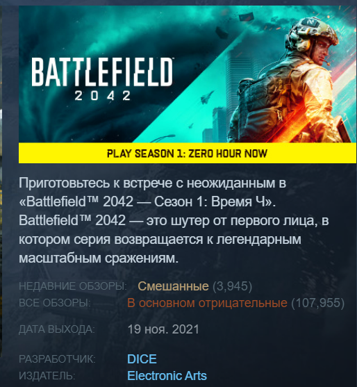 Battlefield 2042 в последнее время получает «смешанные» отзывы, 40% положительных из 3945 штук.