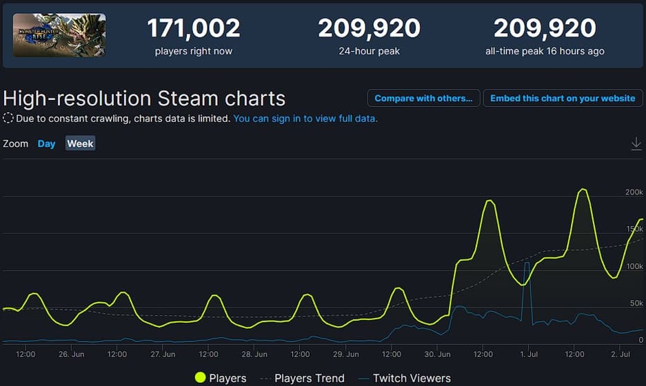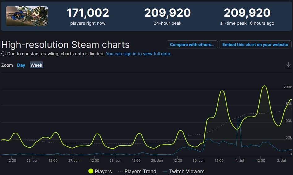 Как показывает SteamDB, релиз дополнения почти утроил количество игроков, одновременно играющих в Monster Hunter Rise. За день до релиза пик составлял около 75 000, а после выхода DLC – достиг почти 210 000.