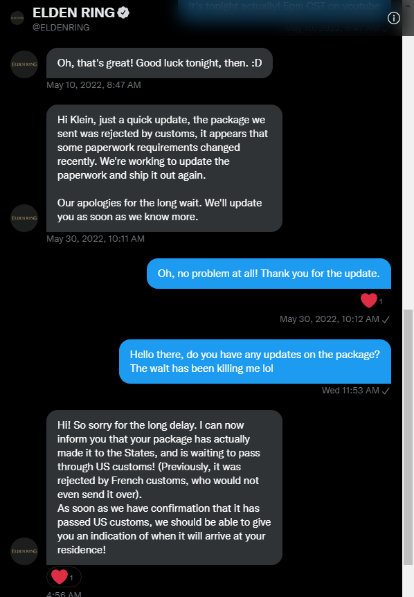 Также игрок рассказал, что французская таможня задержала подарок Bandai Namco Entertainment. На данный момент удалось решить данный вопрос. Теперь заветную посылку обрабатывает таможня США.