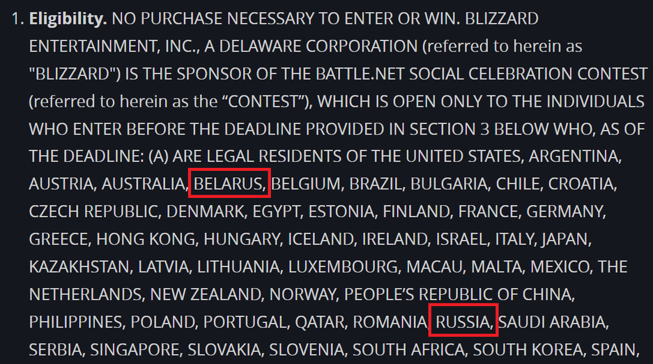 Учитывая политику компании Blizzard, примечательно, что в списке стран-участниц есть Россия и Беларусь.