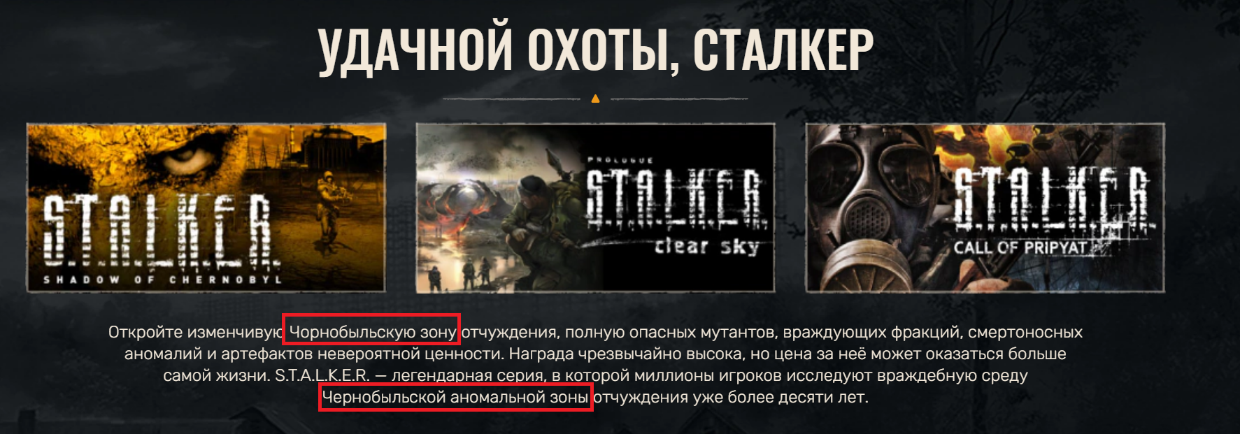 В блоке, который посвящён предыдущим играм серии S.T.A.L.K.E.R., не смогли до конца изменить описание. В самом начале «Чернобыльскую зону» успешно исправили на «Чорнобыльскую зону».