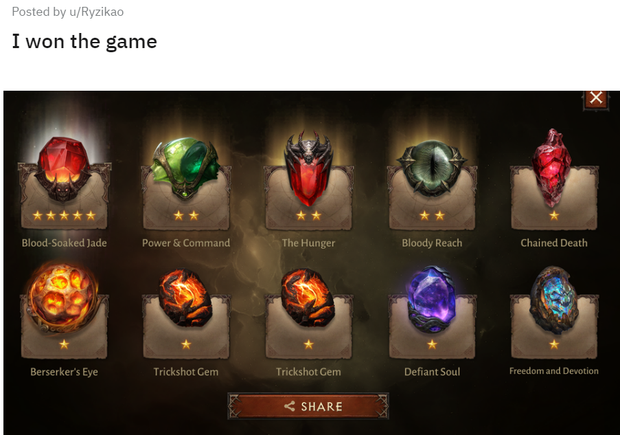 Пользователь Ryzikao решил поделиться радостью с сообществом Diablo Immortal. Ему удалось добыть 5-звёздочный самоцвет. Вскоре он вышел с новой публикацией — заполучил ещё один редкий самоцвет.