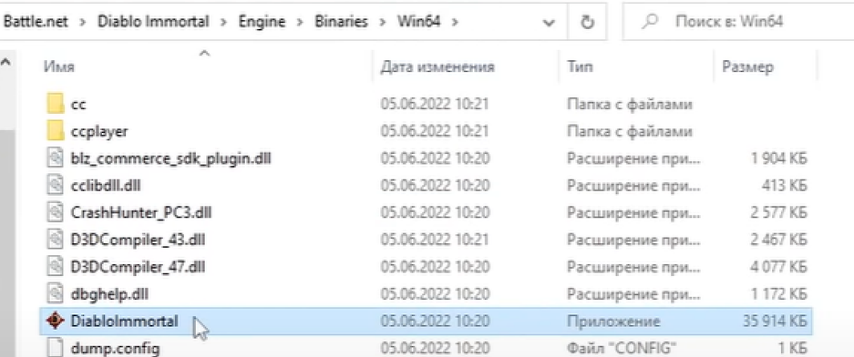 - В папке с игрой Diablo Immortal перейти в Win64, создать ярлык файла DiabloImmortal.exe