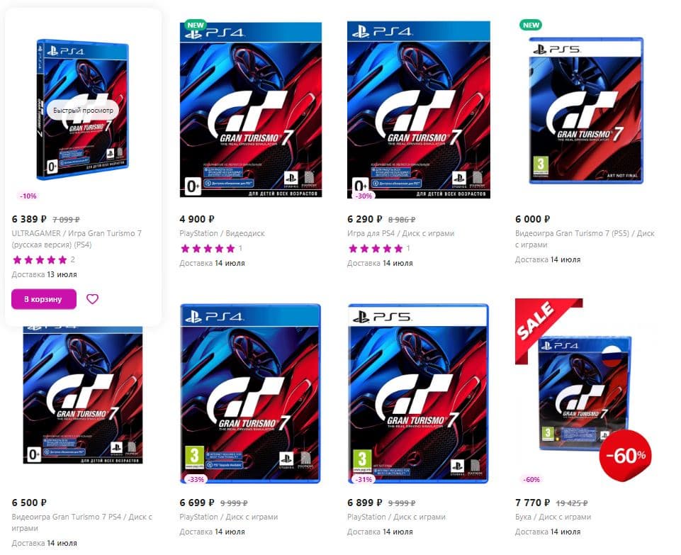 Wildberries и OZON начали продажу игр для консолей PlayStation 5, ввезенных по программе параллельного импорта. Сейчас на торговых площадках можно приобрести консольные эксклюзивы PlayStation Gran Turismo 7 и Ghostwire: Tokyo с русскими субтитрами по цене от 4 500 до 9 000 рублей.