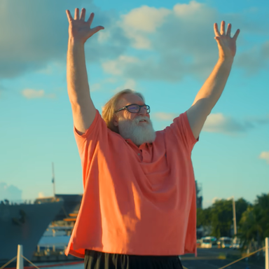 Знаменитые персоны обращают взор в небеса и поднимают руки вверх, чтобы помочь главному герою зарядить технику