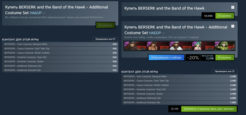 Пример страницы BERSERK and the Band of the Hawk в Steam для России и другой страны: