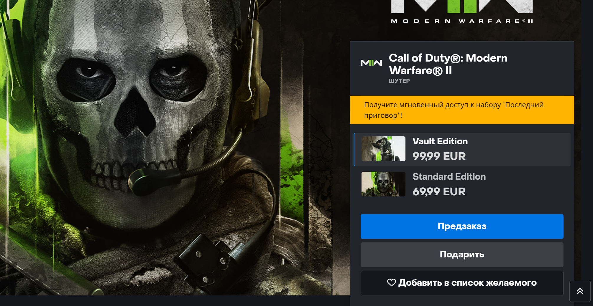 Например, стандартное издание Call of Duty: Modern Warfare II стоит 69,99 евро, а 99,99 евро попросят за премиальное. Комплект Overwatch 2 обойдётся в 39,99 евро.