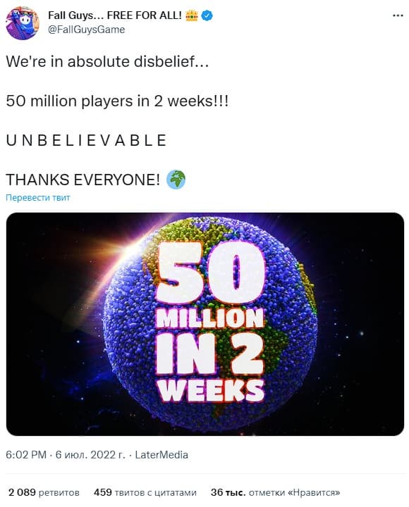 Студия Mediatonic недавно подтвердила, что всего за две недели Fall Guys набрала 50 миллионов игроков, развиваясь быстрее, чем самые популярные конкуренты. Для сравнения, Warzone и Apex Legends потребовалось около 4 недель, чтобы собрать 50 миллионов игроков, а Fortnite преодолела отметку в 45 миллионов игроков через 16 недель.