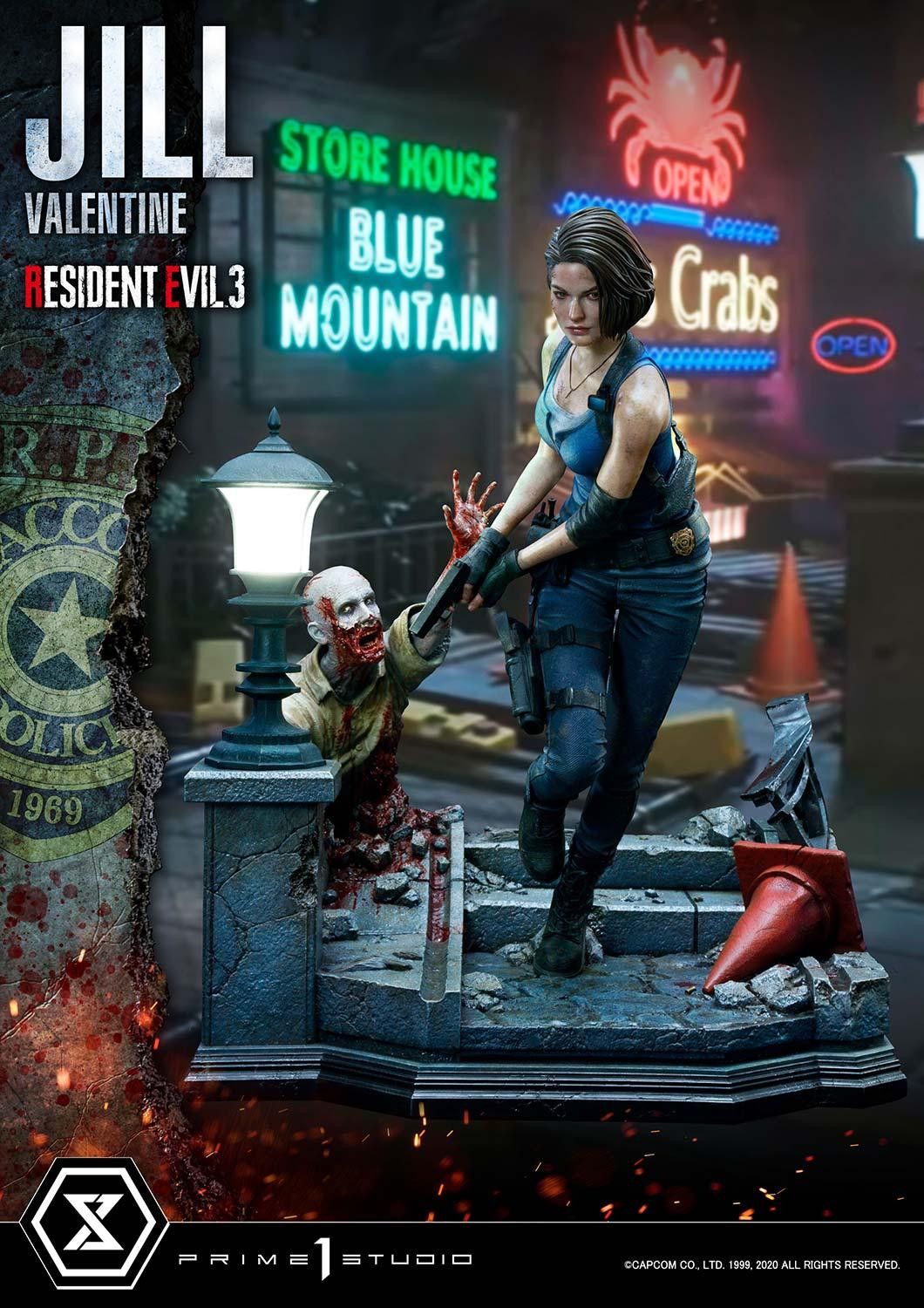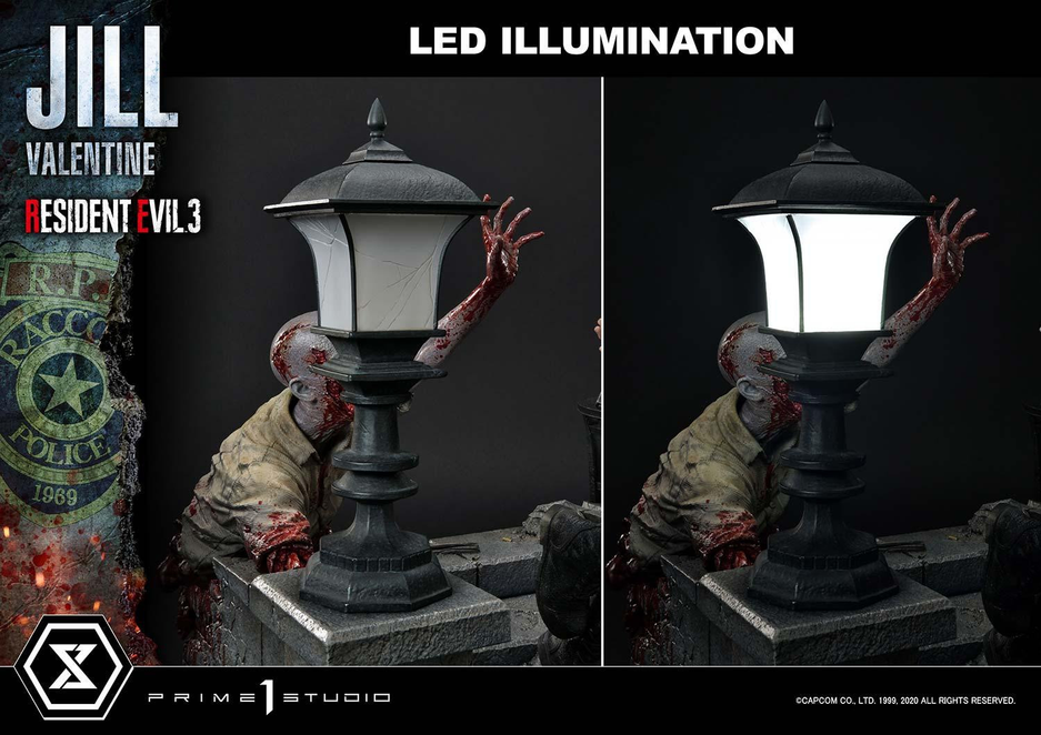 Главная героиня Джилл Валентайн предстаёт в знакомом по игре наряде и с оружием в руках. В комплекте подставка с половинкой зомби и подсветкой.