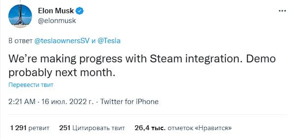 По словам бизнесмена, сейчас компания делает успехи в интеграции Steam. Демонстрацию можно ждать уже в следующем месяце.