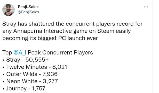 Stray побила рекорд одновременного количества игроков для любой игры Annapurna Interactive в Steam, став крупнейшим запуском на ПК в истории издателя.