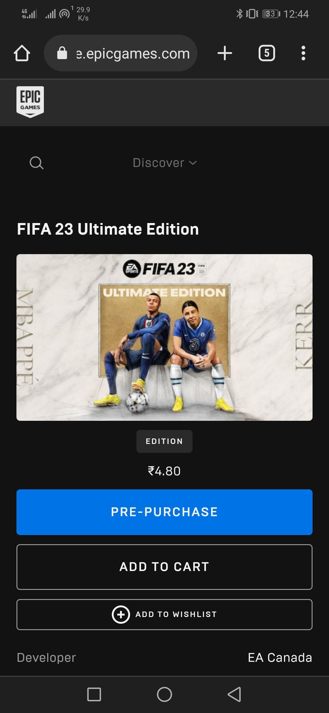 Какое-то время ультимативное издание FIFA 23 продавалось в Epic Games Store за 4.8 индийских рупий, или 3.8 рублей по текущему курсу ЦБ РФ. Для сравнения, EA просит 89 евро за Ultimate Edition в Steam.