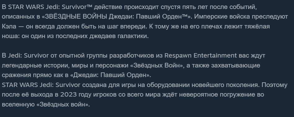 Тем временем страница Star Wars Jedi Survivor появилась в Steam, даты выхода (в т.ч. «2023 год») на текущий момент нет.