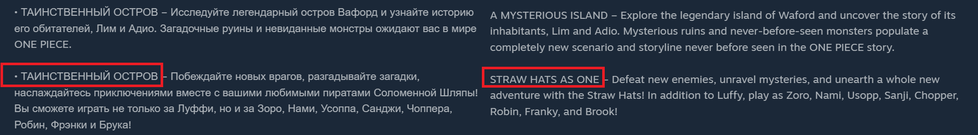 В описании One Piece Odyssey в Steam есть неточность: дублируется «таинственный остров». На англоязычной странице во втором случае используется «straw hats as one», где под «straw hats» понимается вся команда Луффи (также порой героев называют «мугивары», яп. Mugiwara, поскольку капитан команды Луффи носит соломенную шляпу).